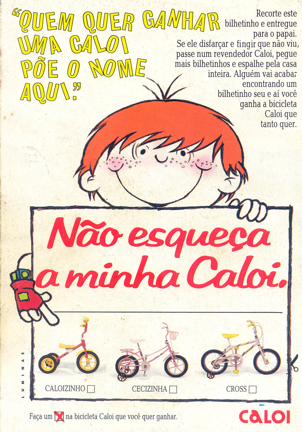 “Não esqueça a minha Caloi” acompanhou milhares de crianças em sua jornada pelo sonho do presente ideal. E isso ajudou a reescrever a história do brinquedo e da própria companhia fundada em 1948 no Brasil pela família homônima. E na estratégia da campanha era fundamental colocar diversos papéis, em todos os locais onde os pais acessavam constantemente, e sendo assim a própria Caloi fornecia até os lembretes para serem colocados e sugeria alguns locais. Um apelo curioso mas que era totalmente abusiva e contrária aos dispositivos da autorregulamentação publicitária que vigora nos dias de hoje. “Na verdade me preocupa por que criança não tem discernimento e às vezes campanhas terminam apelando como exemplos de marcas que até foram punidas por órgãos, a campanha em sua essência deve ser direcionada para os pais, mas, não é isto bem o que ocorre. Às vezes as crianças exigem aquele produto e os pais não tem condições”, comenta Iran Pontes, fundador do Design Culture, portal informativo sobre criatividade e comunicação.